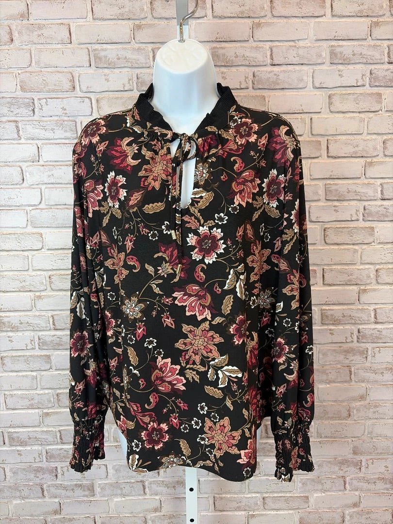 Anne Klein top in Black Multi presents a floral motif and a tie-neck detail. The relaxed silhouette pairs with tailoring or denim, while long sleeves finish at gathered cuffs for a versatile everyday option.